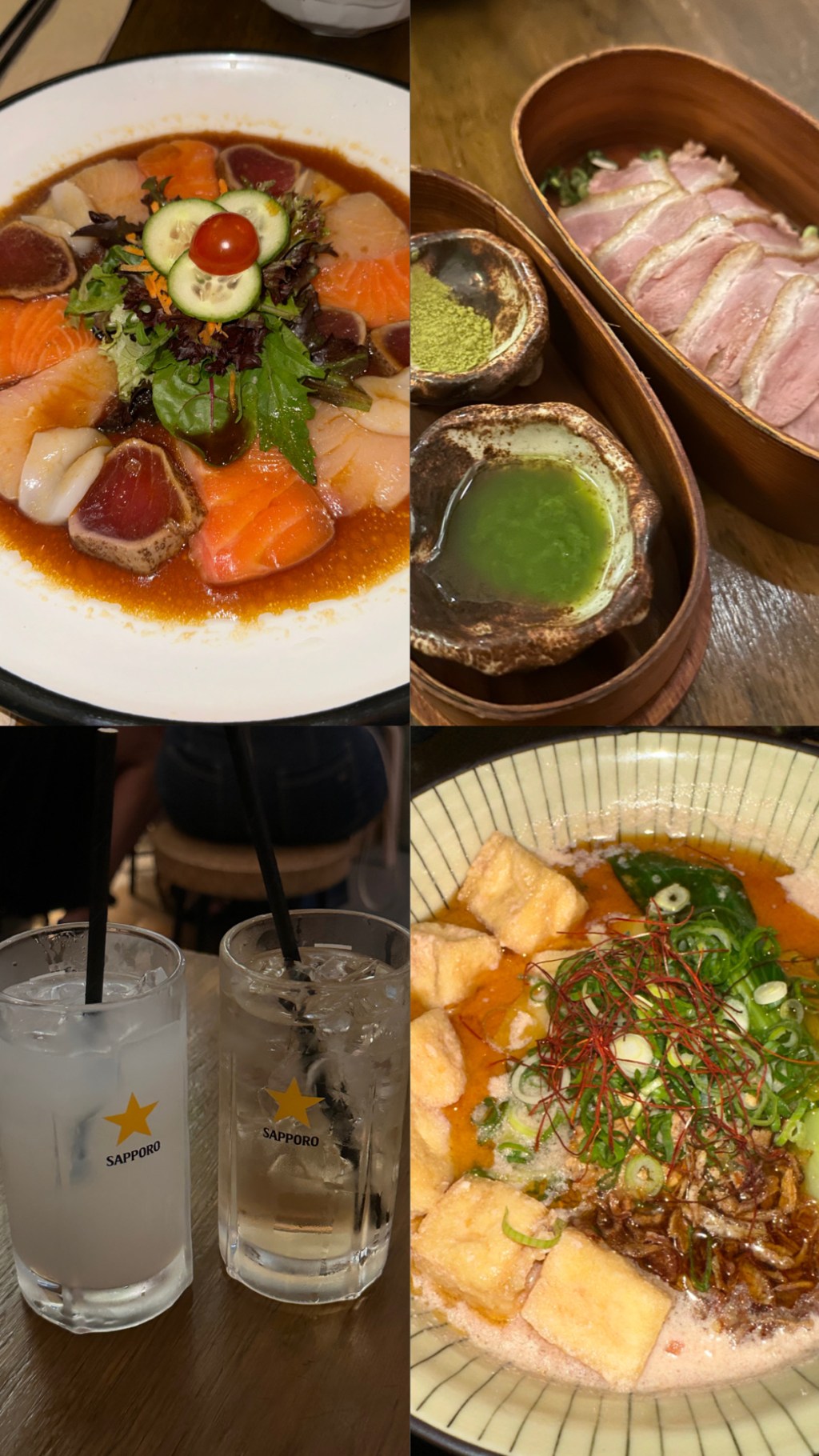 Like a sun rays, like a flower that has just opened– in comes the mixed sashimi carpaccio, arguably the prettiest dish on the menu, coy and tangy with yuzu ponzu dressing. The plate it’s on is huge, and the garden salad arranged in a small mountain in the centre is deceiving of the fact that the sashimi is also, very much, huge. Each piece is fatty and luxuriant and the sourness of the yuzu ponzu makes those highballs go down quick. The richness makes me feel a little full but I do not falter… for in fact the leading act is about to arrive.