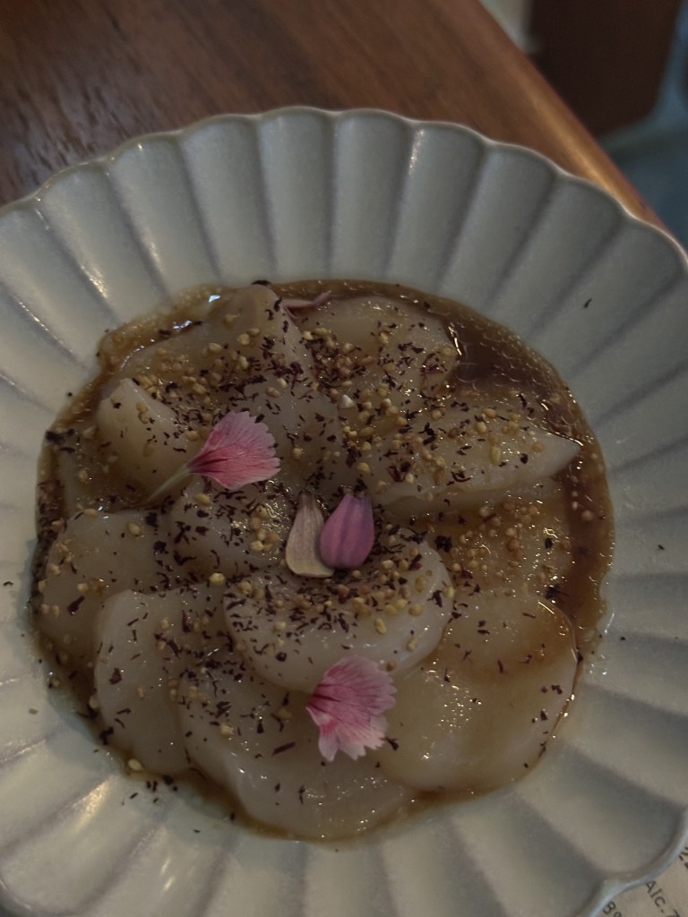 A highlight from the typed menu was a flower of Hokkaido scallop sashimi, ume and white soy. The earthiness from the sprinkling of toasted sesame seeds paired with the satiny bites of raw scallop perfectly. Another highlight, was a teeny mound of clack oscietra caviar with crushed potato chips on a pillow of bechamel sauce. Bite-sized luxury. Salty, creamy, crunchy… (* ´ ﹃`*) ᶻ 𝘇 𐰁